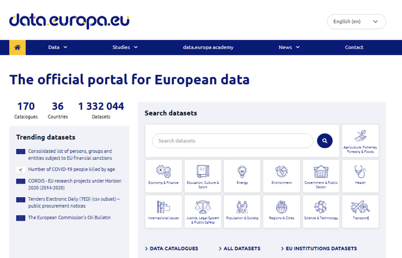 Avrupa verileri resmi platformu Data Europe 36 ülkeden 1.332.044 tane veri kümesini 170 katalog üzerinden 24 farklı dil seçeneği ile araştırmacılara ve kullanıcılarına sunuyor. Bu platformda konular 13 başlık altında sınıflandırılıyor;