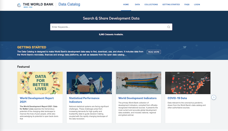 Dünya Bankası Grubu’nun “Veri Kataloğu (Data Catalog)” sayfasında mikro veri, finans ve enerji veri platformlarından gelen açık veri araştırmaları ve veri kümeleri sunuluyor ve söz konusu verilerin bulunması, kullanılması, paylaşılması kolaylaştırılıyor. Verilerin detaylı listesine veri kataloğu üzerinden ücretsiz ve açık şekilde erişebileceğiniz gibi veri kataloğundaki araştırmaları ülkelere, kaynağına, koleksiyonuna, kaynak tipine ve lisansına göre filtreleyebilirsiniz.