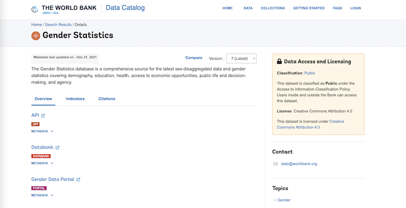 Öncelikle veri setinin 21 Aralık 2021 tarihinde en son güncellendiğini ve bu veri setlerinin kamu konu alanı hakkında yapılmış bir çalışma üzerinden elde edildiğini paylaşalım. “Creative Commons Atıf 4.0” lisansı ile lisanslanmış bu veri setleri Dünya Bankası’nın kullanıcı olan veya olmayan kişilerin erişimine açık. Bu veri setlerine birden fazla kaynak tipinde (API, Databank, Zip, Portal) erişilebiliyor.