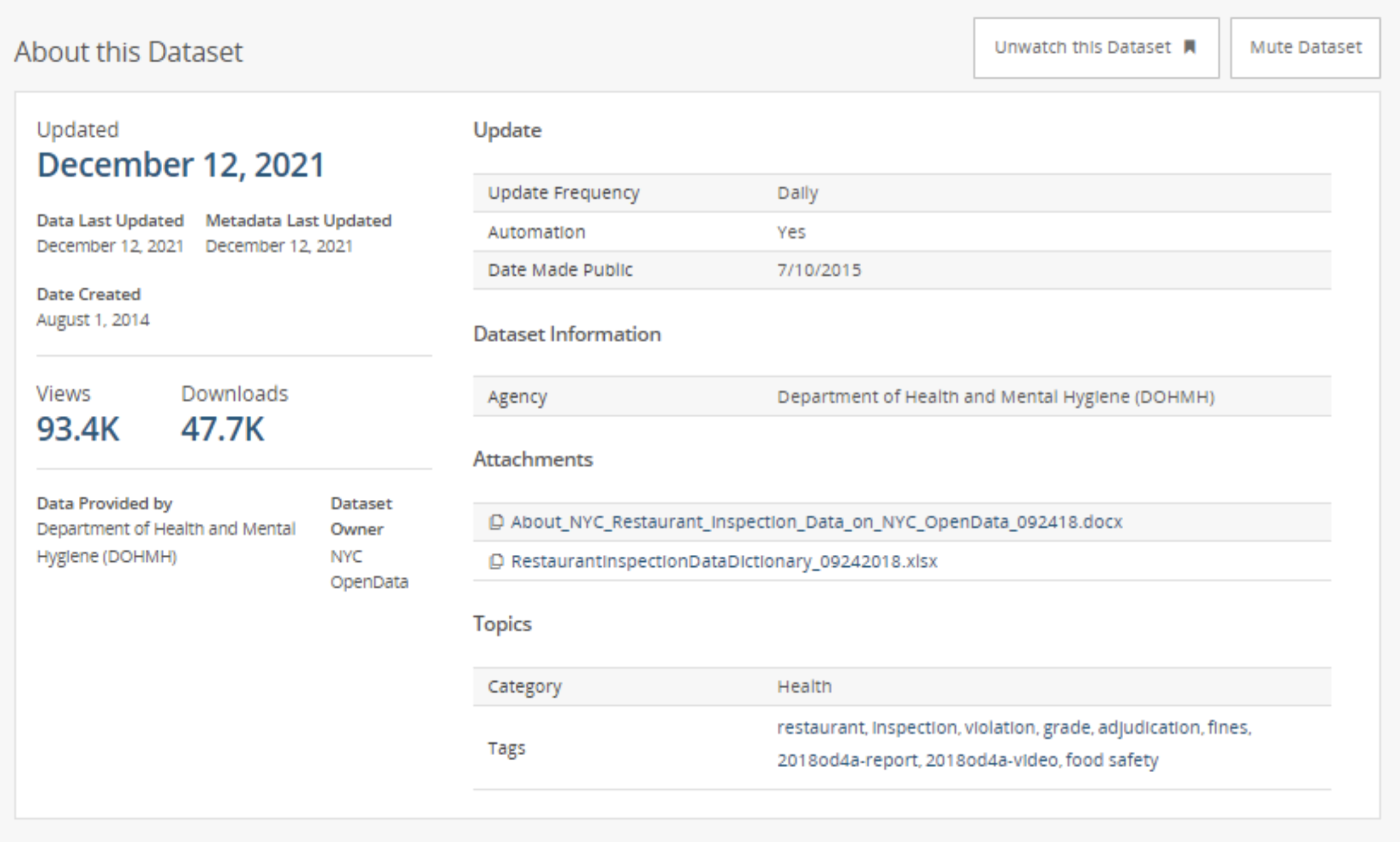 2015 yılında kamuoyu ile paylaşılmaya başlanılan restoranların verileri NYC nin Open Data sayfasında yer sağlık kategorileri başlığı altında yer alıyor. Sağlık ve Ruh Sağlığı Bölümü’nün New York’daki restoranları denetlemeledikten sonra elde ettikleri sonuçları bu açık erişim platformunda paylaşmaktadır. Veri setinde yer alan restoranlar, en son denetlemesi üzerinden 3 yıl geçmemiş ve aktif durumda olanlar. Bu denetlemelere restoranların aldıkları ihlal ve ihlal kayıtları eklenmiş.