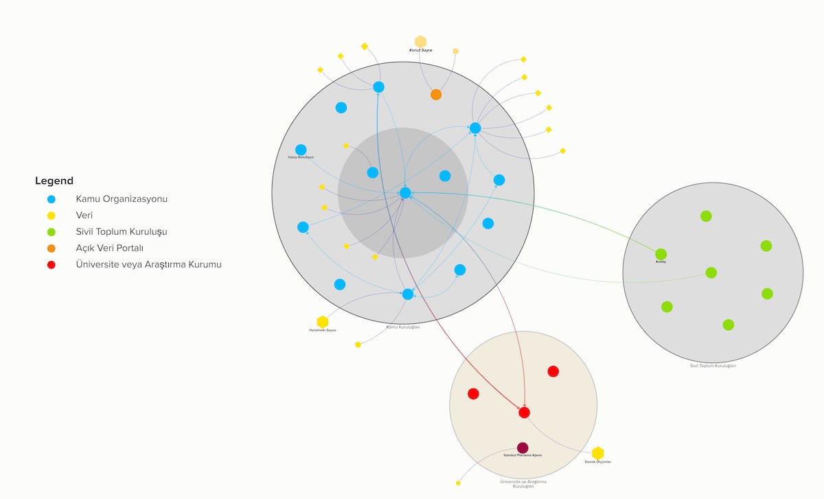 Bu harita sayesinde verilerin varlığını dolayısıyla yokluğunu da ortaya koyarak kamu, üniversite ve sivil toplum kuruluşlarının veri sahipliğini ve birbirleri ile etkileşimini tespit etmiş olduk. Dinamik bir ağ haritası olması sayesinde kurumlar açık veri ürettikçe harita güncellenebilmektedir.
