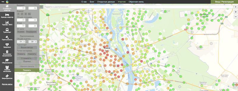 Sağ sütunda yer alan: daire maliyeti, kiralık apartman, kamu hizmetleri tarifeleri, ulaşım, suç sağlık, kirlilik kaynakları, eğitim, sakinlerin değerlendirmesi, olaylar ve diğer başlıklar ise şehir ölçeklendirmesi hakkında daha detaylı ve sınırlandırılabilecek verilere erişimin mümkün olduğunu gösteriyor. Böylelikle başta Ukrayna vatandaşları olmak üzere, veri okur yazarı kişiler kendileri ve aileleri için en doğru yaşam yerini bu açık verilerden faydalanarak seçebiliyor. Bütçelerine ve sosyal yaşamlarına uygun bir bölgede yaşamayı tercih edebiliyorlar.